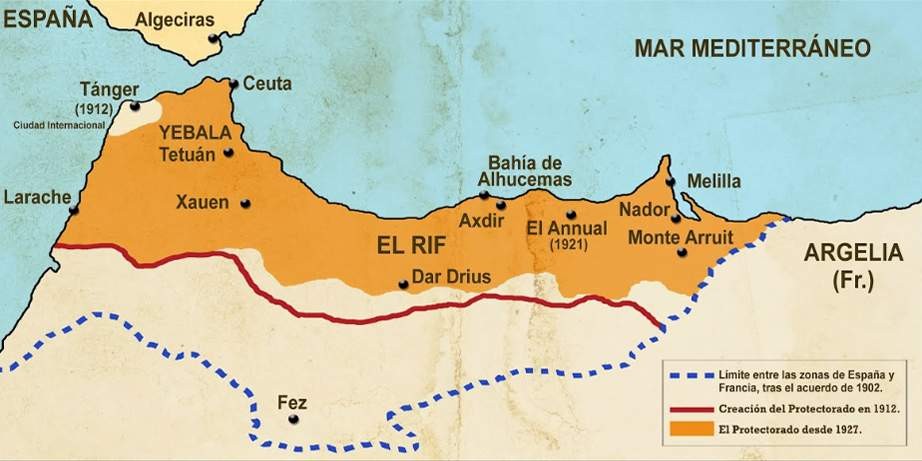 В 1921 году Абд-эль Керим, вождь горцев, поднял восстание против испанцев. Неожиданно испанские войска оказались окружены и разбиты в битве при Анвале. Тысячи убитых. Десятки тысяч винтовок, 400 пулемётов и сотня орудий попали в руки повстанцев. Вскоре Абд-эль Керим провозгласил независимую Рифскую республику — по имени горной области Риф в Марокко.