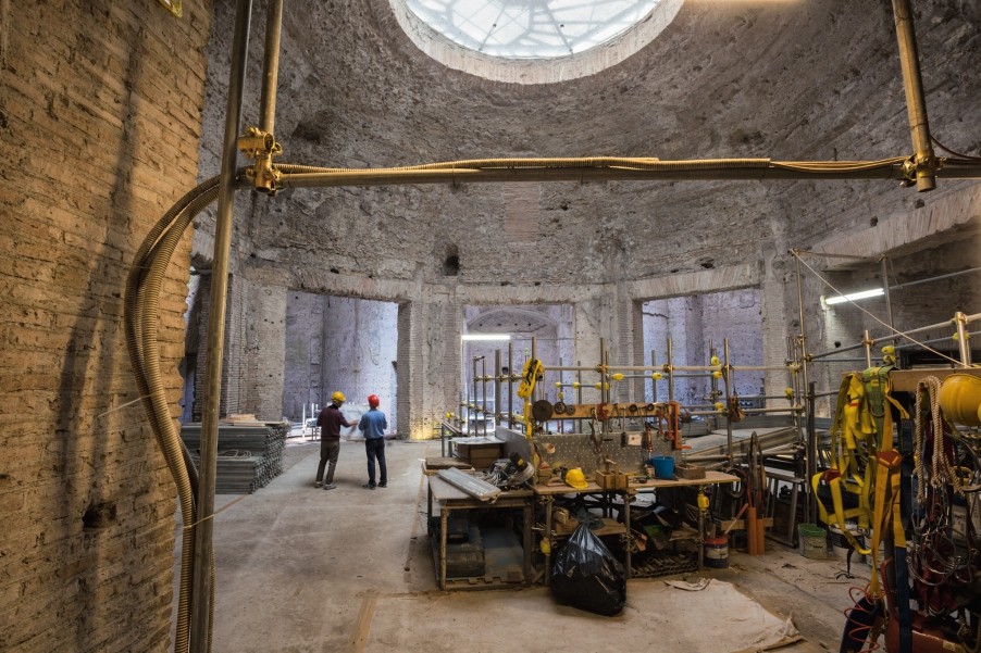 Восстановительные работы в восьмиугольном зале дворца Нерона Domus Aurea, где император, вероятнее всего, устраивал приемы. Кусочки синего, зеленого и белого стекла когда-то составляли мозаику, украшавшую купол, и переливались в лучах света. Министерство культуры, Особое управление археологическим наследием Рима.