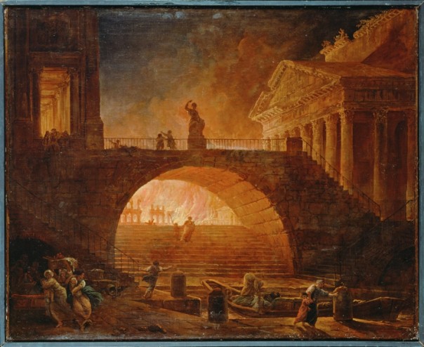 На полотне изображен Рим в пламени пожара 18 июля 64 года новой эры. «Пожар Рима», 1770−1790 годы. Художник: Юбер Робер, Музей современного искусства имени Андре Мальро