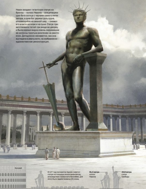 К юго-западу от этого крыла Золотого дома, на месте, бывшем во времена Нерона искусственным озером с морской водой, располагается Колизей. Известный всему миру гигантский амфитеатр, построенный Веспасианом, который пришел к власти вскоре после самоубийства Нерона [вслед за тремя сменившими друг друга за один год гражданской войны императорами – прим. переводчика], был назван в честь 30-метровой бронзовой статуи Colossus Neronis, представлявшей Нерона в образе бога солнца.