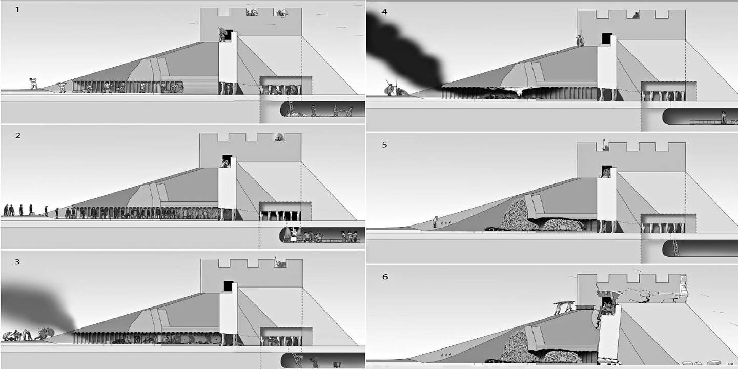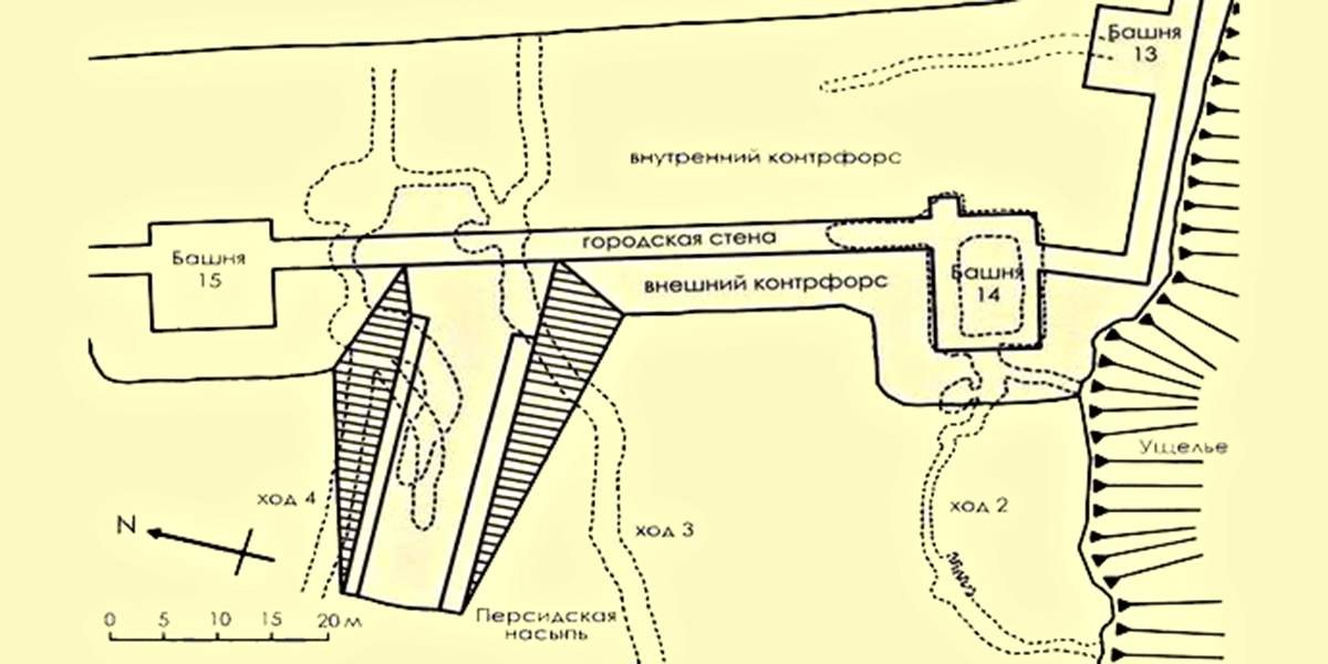 Персы подвели к крепостной стене возле башни № 15 осадную насыпь. Кроме того, археологи обнаружили целый лабиринт подземных ходов, которые создавали как осаждающие, так и осаждённые.