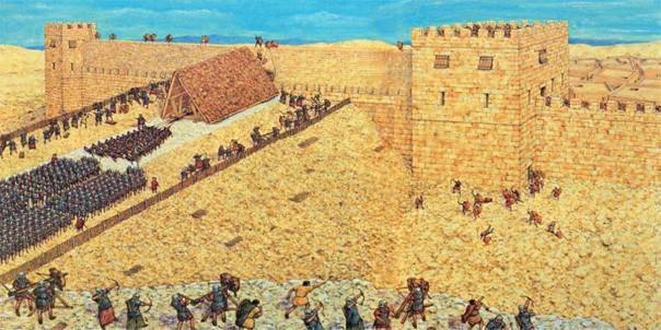 Ассирийский царь Синаххериб в 701 году до н. э. осаждал в Иудее город Лахиш. На раскопках нашли большую осадную насыпь, построенную ассирийскими воинами. В ней обнаружили наконечники стрел, которыми обстреливали осаждающих с крепостной стены. Со своей стороны осаждённые внутри города также строили насыпь. Но ассирийцы в этом соревновании одержали победу — и взяли Лахиш.