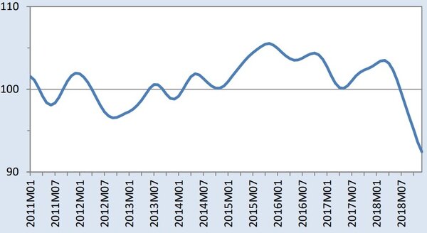 Торговля автомобилями и электронными компонентами снижается сильней всего: в декабре 2018 года по отношению к декабрю 2017 года падение составило -10,3 и -12,9 пунктов соответственно. Это уже не падение. Это обвал. Это худший данные более, чем за десять лет, то есть за всё время существования данного индикатора!
