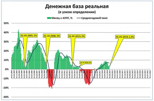 На графике 2 он прекрасно виден. Так, 1 марта 2005 г. (ровно 14 лет назад) темпы роста реальной денежной базы упали до 1%. И все могло бы быть так же плохо, как в 2008 или 2013 гг. Но тогда беды не случилось. Почему? Тогдашние руководители ЦБ смогли быстро восстановить рост денежной базы. Уже к 1 августа 2005 г. денежная база росла темпами 13% годовых, а к октябрю того же года темпы превысили 20%.