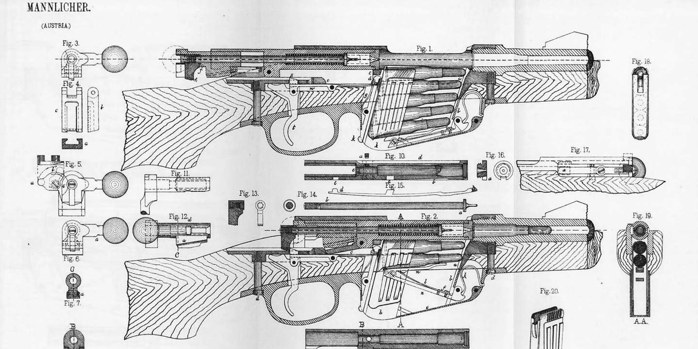 В 1885 году австриец Фердинанд Манлихер разработал свой вариант коробчатого магазина, отличавшийся тем, что он заряжался не по одному патрону, а сразу пятью, объединёнными в пачку.