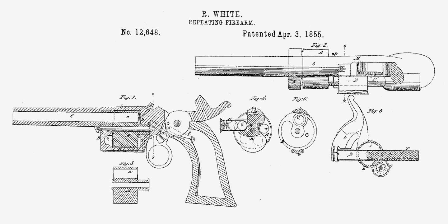 А при чём тут коробчатый магазин, спросите вы? При том, что, согласно патенту, барабан револьвера Уайта автоматически заряжался патронами из отъёмного коробчатого магазина, примыкаемого горизонтально слева позади барабана.