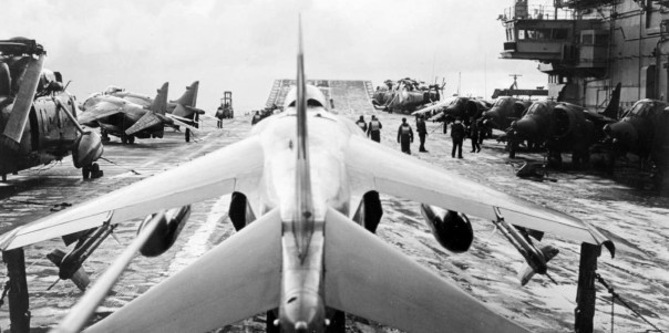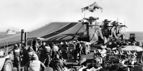 На палубах так тесно от самолётов и вертолётов, что теперь разрешено всё, что запрещалось в мирные дни: руление задом, взлёты с пробегом ниже минимального и посадки прямо в гущу самолётов. Ах да, если аргентинская противокорабельная ракета „Экзосет“ влетит авианосцу в правый борт, то попадёт точнёхонько в пилотскую инструктажную и раздевалку!».