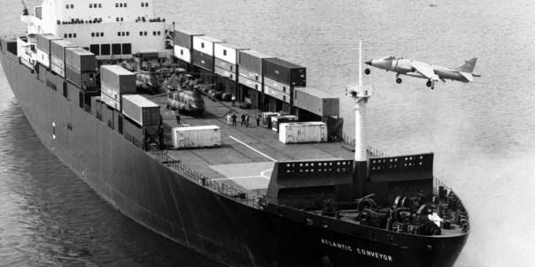 С острова на авианосцы «харриеры» перевозили на борту контейнеровоза «Атлантик Конвейер», превращённого в огромный плавучий склад