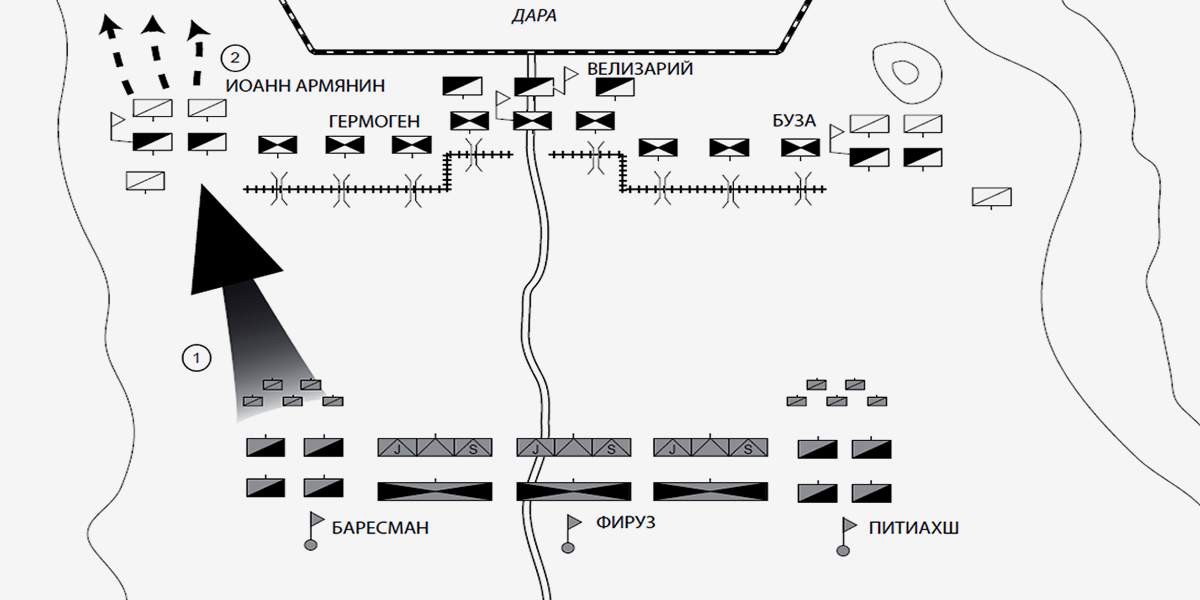Битва при Даре: начало. Карта из книги Б. Т. Кэрри «Дорога на Манцикерт: византийское и исламское военное искусство, 527–1071 гг.»