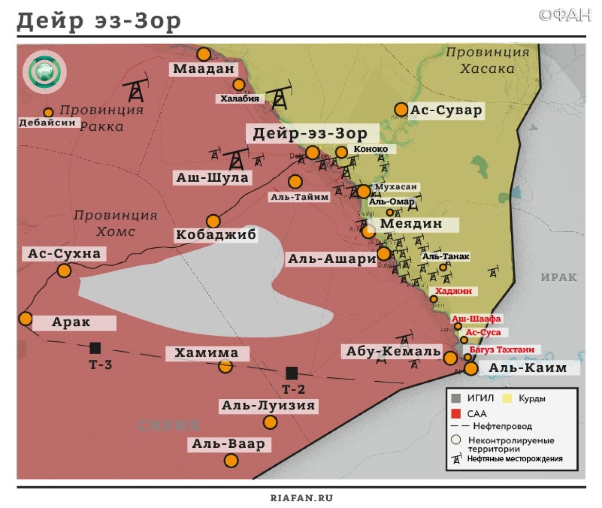 Агентство новостей DeirezZor 24 сообщает о том, что правительственные войска приступили к укреплению своих опорных пунктов в районе города Меядин юго-восточнее административного центра региона. Со ссылкой на слова местных активистов интернет-портал передает, что подобные меры принимаются с целью устранить любые угрозы безопасности гражданских лиц.