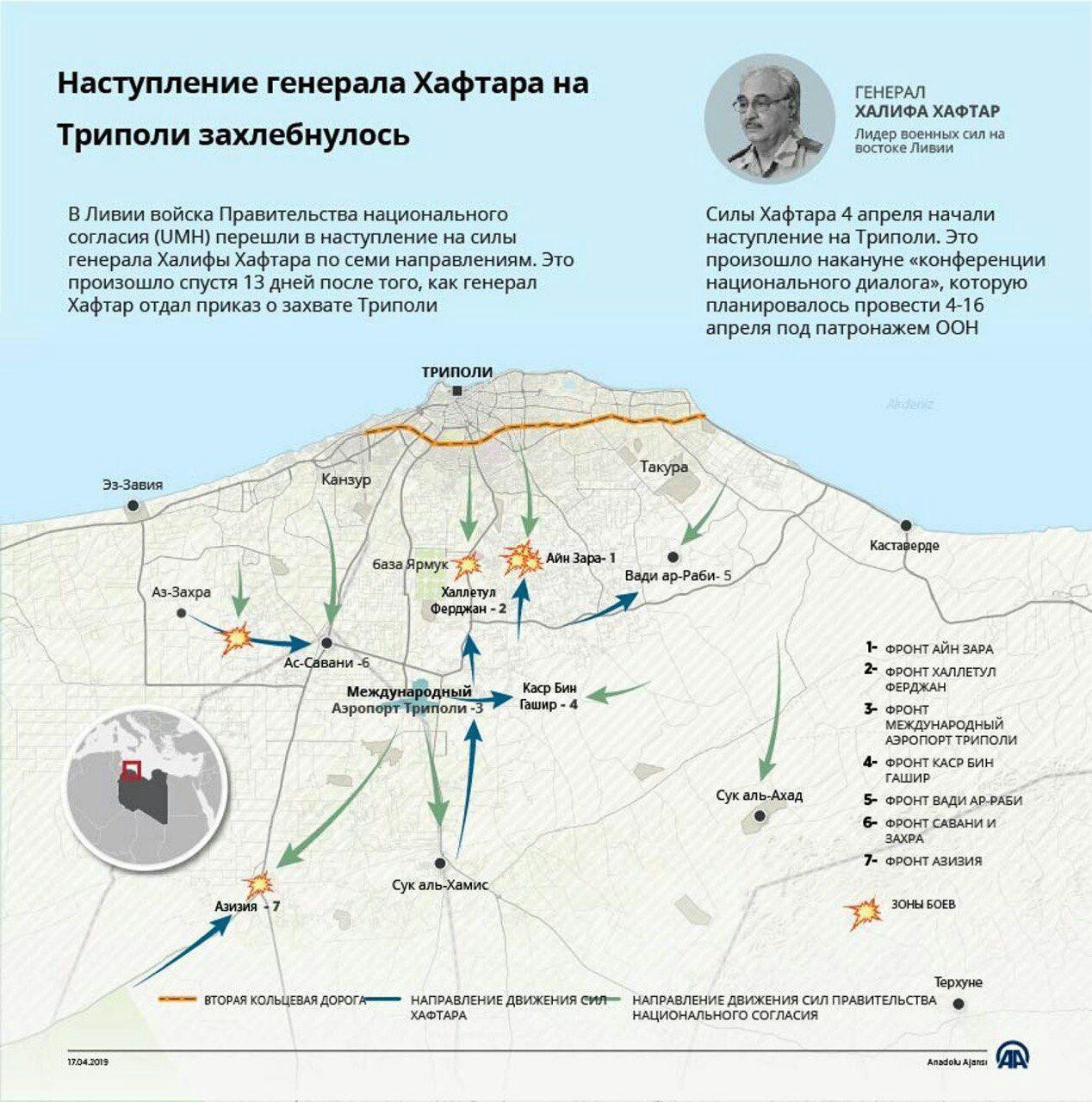 18.00. Согласно некоторым сообщениям, прямую военную поддержку силам Хафтара в Ливии оказывают Объединенные Арабские эмираты — авиация ОАЭ присоединилась к проведению воздушных ударов по силам Правительства Национального согласия. Самолеты и беспилотники ОАЭ располагаются на ливийской базе аль-Хадим, в частности 18 апреля было задействовано два БПЛА китайского производства Wing loong-1.