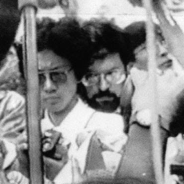 В нарушение указов о чрезвычайном положении, объявленном в части Пекина, Джон Е. Помфрет (John E. Pomfret), корреспондент AP в Пекине, вступал в частые контакты с главарями, передавая им информацию и предоставляя убежище. На снимке: Джон Е. Помфрет (в центре) и Ван Дань (первый слева) вместе.
