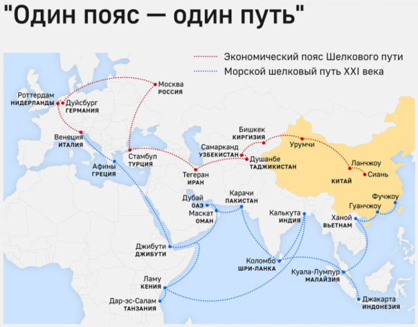 Примерно так и появилась эта инициатива. Сначала её назвали "Шёлковый путь" в честь древнего торгового пути из Китая на Запад. Но это замыкало Китай на строительство инфраструктуры только в странах Азии. "Мелко это как-то, — подумали в Китае. — Не зря же мы называемся Поднебесной (то есть "весь мир")!" И придумали "Экономический пояс Шёлкового пути и Морской Шёлковый путь XXI века", но этот бренд как-то не прижился, и появился "Один пояс, один путь", сокращённо ОПОП.
