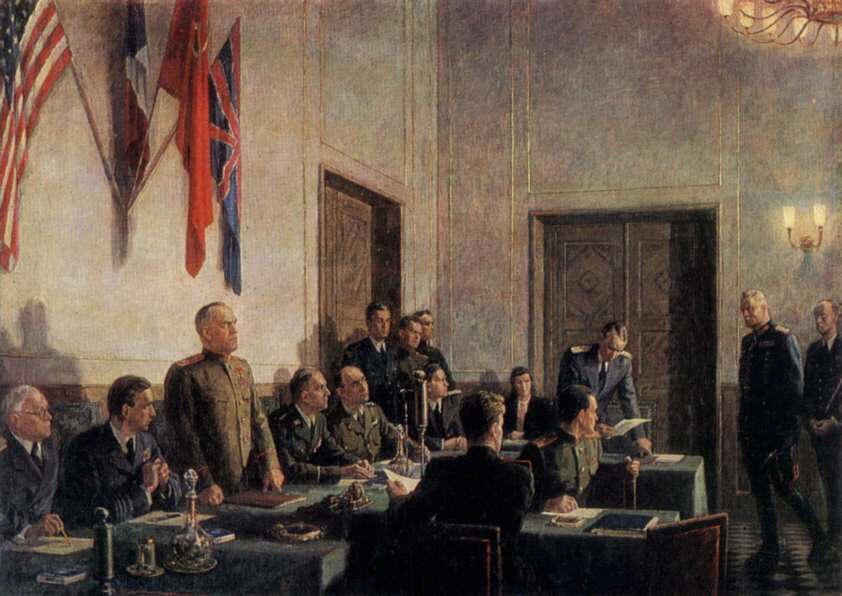 Окончательный Акт о безоговорочной капитуляции Германии и ее вооруженных сил от имени германского вермахта подписали генерал-фельдмаршал В.Кейтель, главнокомандующий ВМС адмирал Фон Фридебург, генерал-полковник авиации Г.Штумпф. СССР представлял заместитель Верховного главнокомандующего маршал Советского Союза Г.Жуков, союзников – главный маршал авиации Великобритании А.Теддер. В качестве свидетелей присутствовали генерал армии США Спаатс и главнокомандующий французской армией генерал Тассиньи.