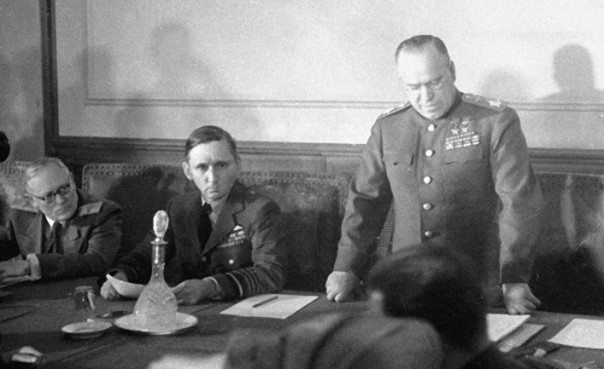 При соблюдении необходимых формальностей маршал Жуков попросил полномочных представителей германской стороны подписать документ, что они и сделали. Этот момент был заснят фотоаппаратами и кинокамерами.