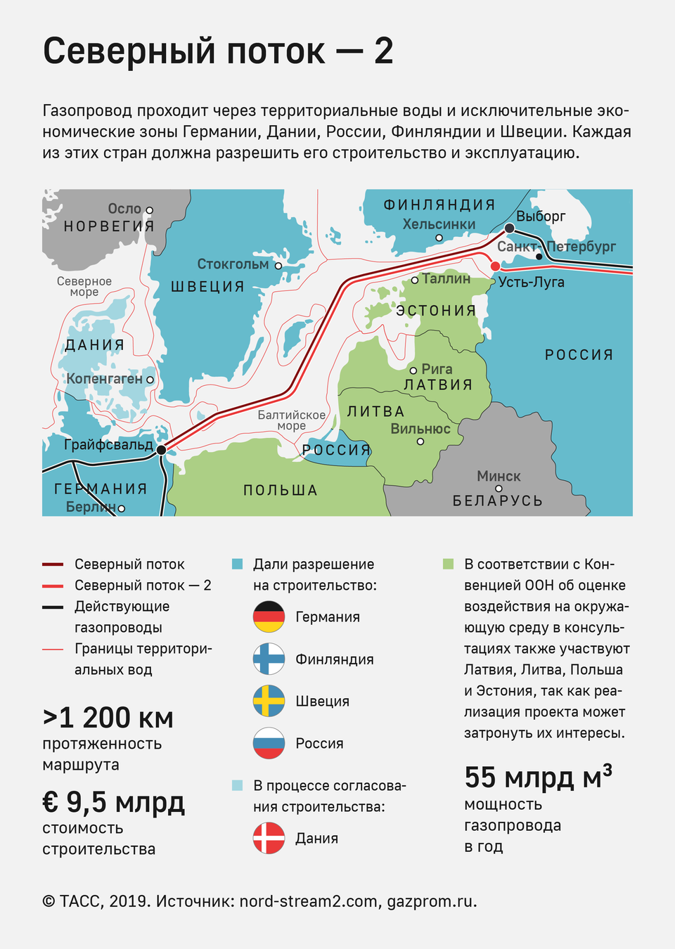Проект "Северный поток— 2" предполагает строительство двух ниток газопровода общей мощностью 55 миллиардов кубометров газа в год от побережья России через Балтийское море до Германии. Его планируется достроить в 2019 году. Газопровод пройдет через территориальные воды или исключительные экономические зоны России, Финляндии, Швеции, Дании и Германии.