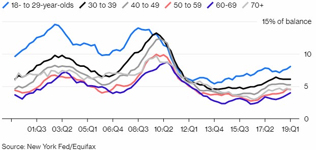Медленно, но уверенно растет количество безнадежных долгов по кредитным картам в возрастных группах 18-29 лет и 60-69 лет.
