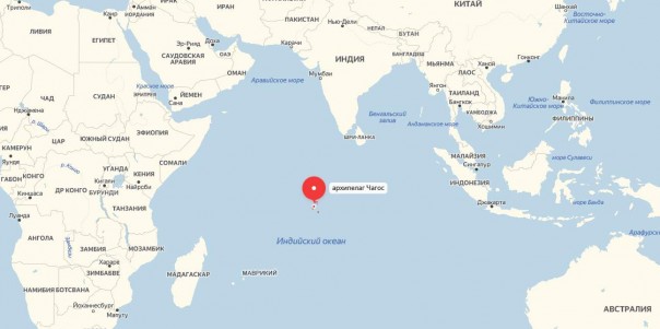 Во-первых, Чагос — это архипелаг Индийского, а не Тихого океана. Понимаем: тепло и там и там — океан, солёная вода, солнце. Но место совсем другое. Смотрим на карту, в самый центр Индийского океана, и смело тычем туда пальцем. Вот, попали в самый Чагос, кроме него там и нет ничего.