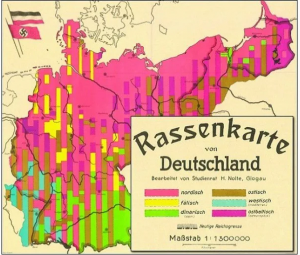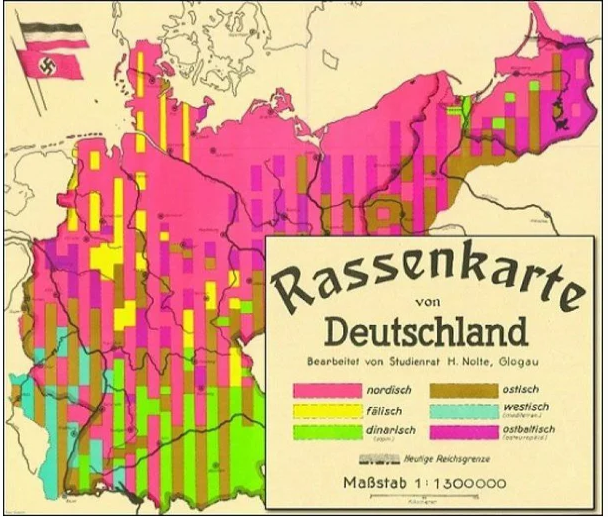 Расологи Третьего рейха составили карту, где чётко видно, что не всё население Германии считалось полностью «полноценным». Достойными считались «нордическая» и «фальская» подрасы. «Динарская» в Баварии и «восточнобалтийская» в Восточной Пруссии не были «полноценными». Необходима была работа, в том числе и «освежением крови» с помощью войск СС, для превращения всего населения Германии в "расово полноценное".