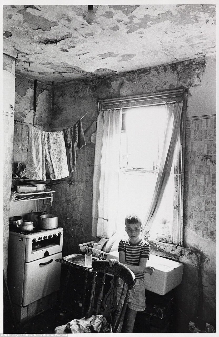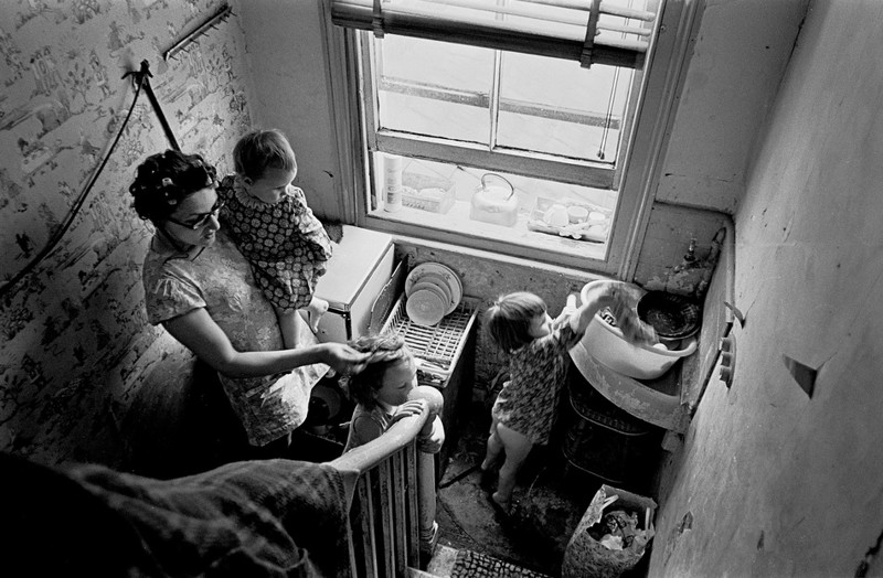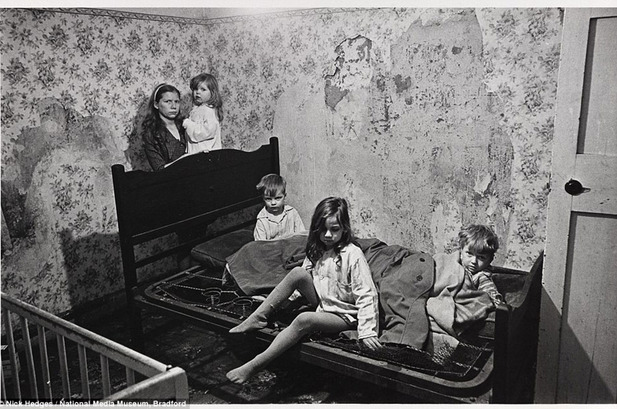 Бирмингем. В квартире нет ни ванной, ни горячей воды. Дети спят, укрывшись старыми пальто и борются за место на матрасе, чтобы не оказаться ночью на пружинах. Кстати, центральное отопление в Британии и ванные/душевые комнаты в домах и квартирах начали появляться только в конце 60-х/70-х. До этого жил фонд был просто не приспособлен в таким "изыскам".