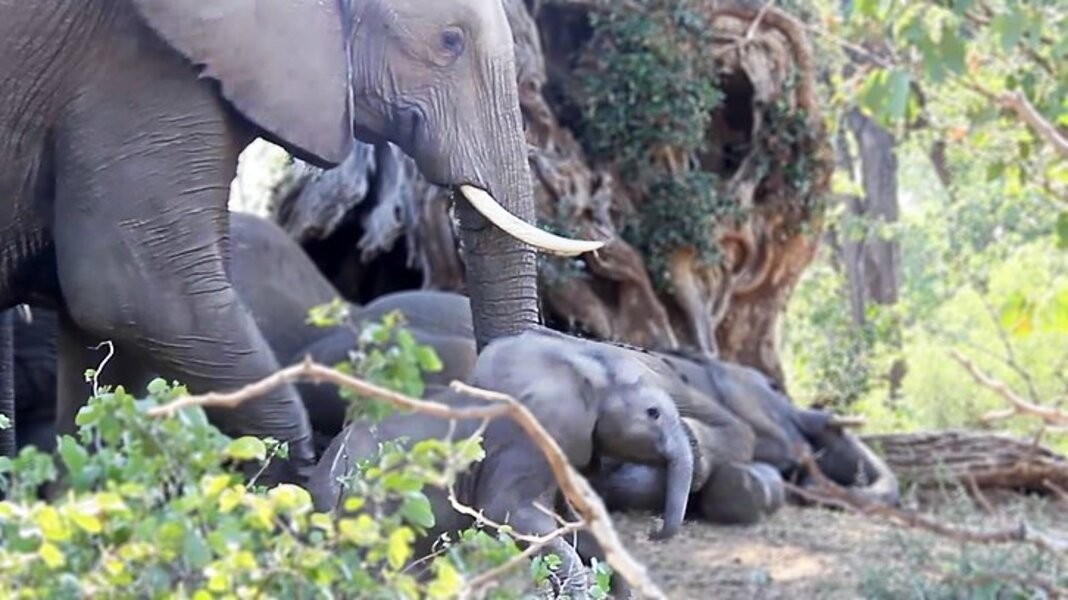 Туристы в Национальном парке Крюгера заметили слонов, спрятавшихся от жары в тени деревьев. Группа мирно отдыхала, а люди наблюдали за животными. Но затем пришло время просыпаться: по крайней мере так решила мама-слониха и принялась будить своих детей.