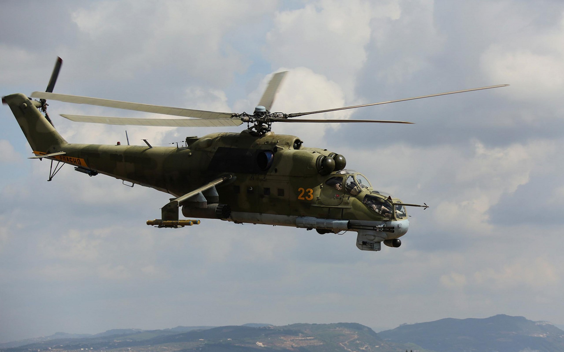 Экипажи вертолётов наносят удары по позициям боевиков в гористой местности. При этом российским командованием осуществляется корректировка работы вертолётов и фактическое управление всей операцией.