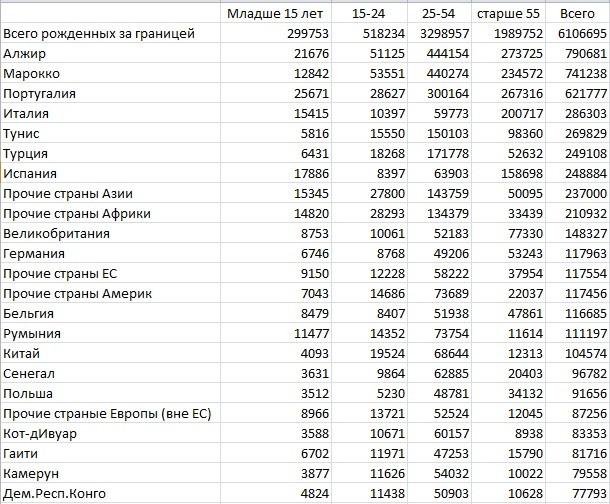 В поисках информации вышел на сайт французского еские данные по населению идентичны тому что видел на сайте Францстата (те показатели которые доступны на обоих сайтах и мог сравнить). Так что источник первички- государственная статистика. Просто в публичном доступе в разрезе стран рождения жителей Франции нашел на сайте именно Института. Данные за 2015 год (не столь свежие как по UK, но что есть). Подготовил франкоязычную таблицу в русском варианте. Данные отсортированы по убыванию. Россия выделена цветом.