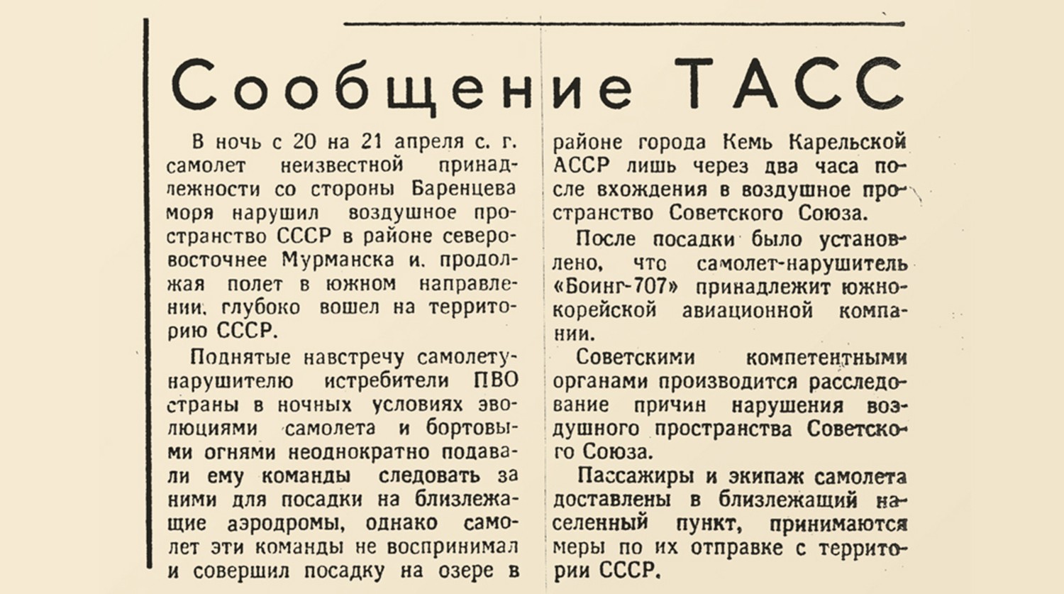 «Самолет углубился в нашу территорию, прошел Мончегорск, идет в 60-80 километрах от границы с Финляндией. И если бы не приняли мер, то не выполнили бы боевую задачу, ведь под личиной гражданского самолета мог идти самолет-разведчик, — вспоминал Царьков. — В тот момент Северный флот проводил крупномасштабные учения. Все было включено, все вышли на свои позиции. Шесть минут — самолета не было бы. Нас бы всех из партии, с должностей, из Вооруженных сил уволили бы — правильно бы сделали... И я даю команду уничтожить самолет-нарушитель границы СССР. Летчик спрашивает — что, по нему стрелять? Повторяю — уничтожить!».