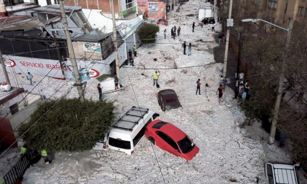 США вышли из Киотского соглашения по снижению вредных выбросов в атмосферу. А на саммите в Осаке Трамп тему экологии задвинул вообще на задний план. Вероятно именно поэтому природа подсунула ему под нос тревожный природный катаклизм в Мексике, соседке Америки. В мексиканском городе Гвадалахара, одном из самых густонаселенных в стране, разразилась чудовищная гроза в разгар жаркого лета. Практически весь город оказался погребённым на два метра под градом. Пока Европа тает от рекордной жары — во Франции столбик термометра показывает выше 45 градусов тепла — Гвадалахару засыпает градом.