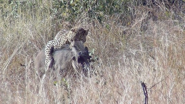 Гид предположила вслух, что громкий визг жертвы привлечет внимание других хищников – и оказалась права! Вскоре рядом появился второй леопард. Кошки начали бороться за добычу, и освободившийся бородавочник не преминул скрыться. Симпатии зрителей остались на его стороне, несмотря на то, что леопард лишился добычи. Источник