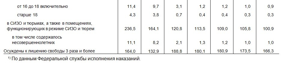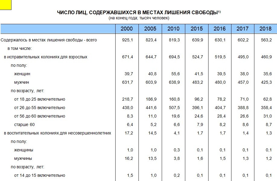 1) Сначала о статистике по современной РФ. С ней проще всего. Спасибо Росстату, они не стали наводить тень на плетень. И в одной таблице чёрным по белому сказано и про заключенных колоний и про заключенных тюрем и про находящихся в СИЗО. Таким образом, мы можем судить о численности (и её динамике) всех заключенных и не гадать о каком круге идёт речь.