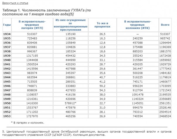 2) Сталинский СССР. Ну количество заключенных в сталинском СССР - это вообще нечто эпическое по количеству раненых и погибших в интернетных баталиях. Да и информацию с чёткими критериями и убедительными источниками найти трудно. Про дичь от либерально-прозападной публики говорить не буду. Это в журнал "Вопросы психиатрии". Но и среди условно просталинских источников тоже найти информацию тяжело. Ибо часто имеют ввиду не общее число заключенных, а только число сидящих по "политическим" статьям и так далее. Также с кругом самих исправительных учреждений путаница и трудно понять о чём идет речь (о полном круге учреждений или нет). Поэтому загружу таблицу от того исследователя о котором слышал наибольшее число уважительных оценок. Как о человеке политически не слишком ангажированном и посвятившем долгие годы архивной работе по данной теме. На его работы с уважением ссылались и рекомендовали широкой аудитории для ознакомления с темой Е.Спицын, Ю.Н.Жуков, А.Колпакиди, люди которых можно заподозрить в чём угодно, но точно не в любви к "десталинизации" . Речь о покойном Викторе Николаевиче Земскове. Не политик, не "правозащитник", в хорошем смысле скучный академический учёный. В отличии от ситуации с явно охватывающей весь круг заключенных статистике Росстата по РФ, я не готов утверждать, что данные Земскова охватывают вообще всех "сидельцев". Я не смог, например, понять включают ли они и заключенных тогдашнего аналога нынешних СИЗО (как данные Росстата). То есть не могу поручиться за эти данные как окончательный и самый широкий круг реально "сидевших". Но насколько могу судить, это наиболее авторитетный, неконъюнктурный исследователь из тех чьи работы доступны. Итак, к его статье "ГУЛАГ (историко-социологический аспект)" опубликованной в журнале "Социологические исследования" за №6 1991 г. прилагается следующая сводная таблица: