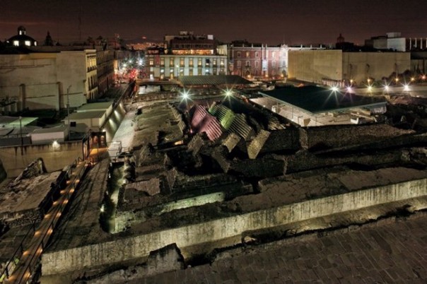 Ночью разноцветные огни освещают руины Темпло-Майор. При раскопках археологи выявили 13 этапов строительства с 1375-го по 1519 годы; двойная лестница пирамиды перестраивалась 13 раз.