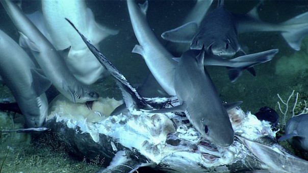 В один из дней погружение проводилось в 130 километрах от побережья Южной Каролины. На глубине около 450 метров была снята захватывающая сцена. Сначала в кадр попала группа колючих акул (катранов) двух видов: Squalus clarkae и Centroscymnus owstonii, поедающих останки 2,5-метровой меч-рыбы. Причина её гибели не известна, но поблизости не заметили рыболовных снастей, так что не исключено, что рыба умерла от болезни или старости.
