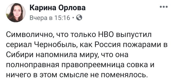 «Символично, что только HBO выпустил сериал «Чернобыль», как Россия пожарами в Сибири напомнила миру, что она полноправная правопреемница «совка», и ничего в этом смысле не поменялось».