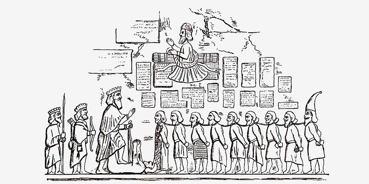 Прорисовка Бехистунского рельефа, изображающего триумф Дария над магом Гауматой (Лжебардией) и мятежными «царями»