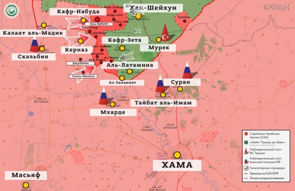 За последние дни на данном направлении был освобожден целый ряд населенных пунктов к западу от Хан-Шейхуна – Зайтун, Кафр-Айн, Ан-Наби, Аль-Эбис, Наби-Юнус и Тель-Айс. В прошлые выходные, кроме того, от исламистов был зачищен ключевой город Аль-Хубейт.