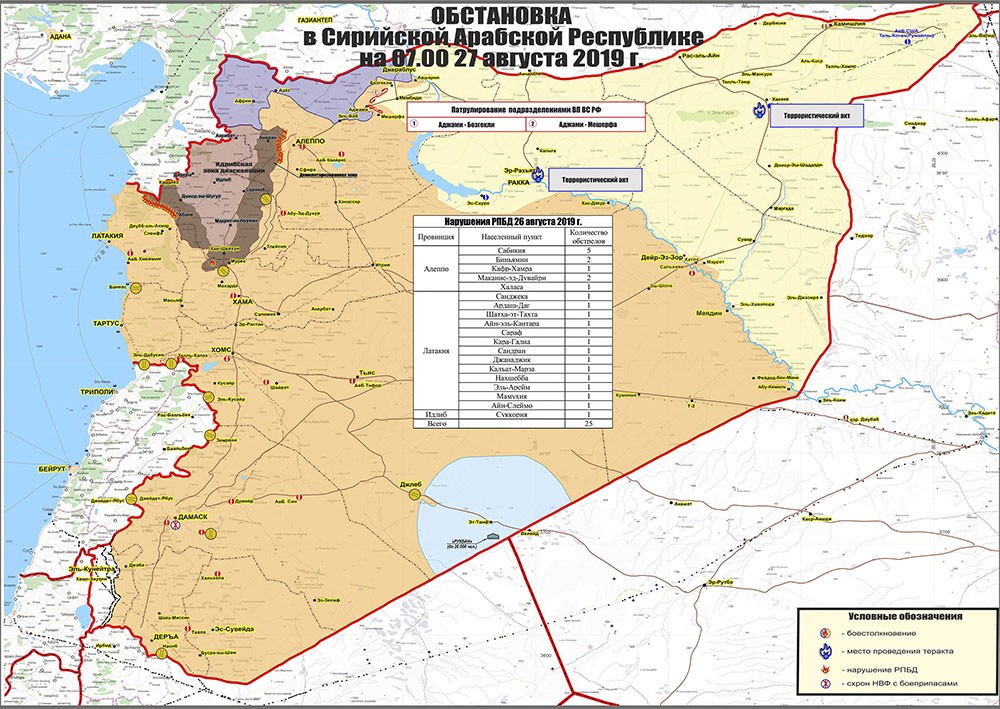Российской частью представительства совместной российско-турецкой комиссии по рассмотрению вопросов, связанных с фактами нарушений режима прекращения боевых действий, зафиксировано 25 фактов открытия огня в провинциях: Латакия – 13, Алеппо – 11, Идлиб – 1.
