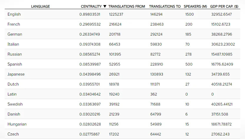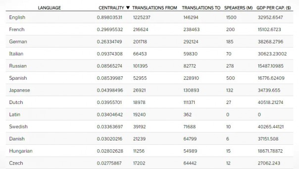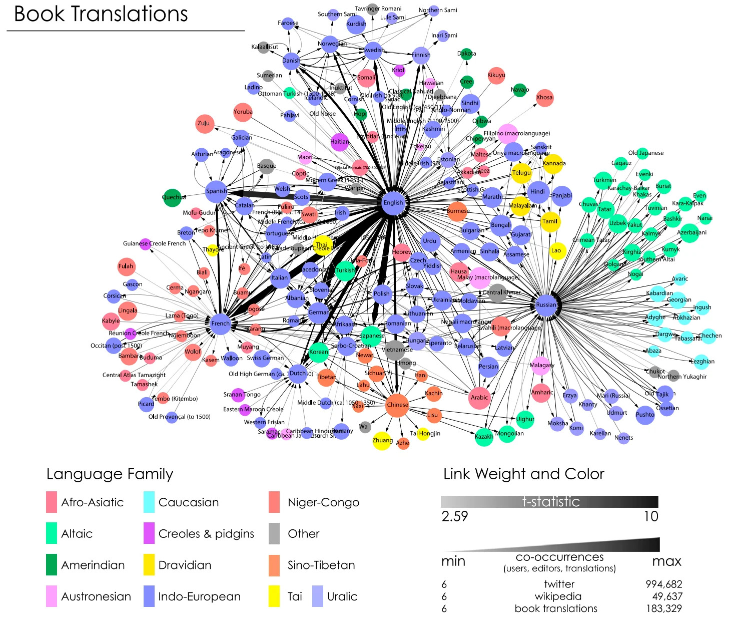 Исследователи из Национальной Академии США поставили задачу выявить самые влиятельные языки мира. Для нахождения связей и зависимостей между языками было проанализировано более 2,2 миллионов переводов книг(из Индеса переводов ЮНЕСКО) на более чем 1000 языков, выполненных в период с 1979 по 2011 гг. При этом, каждый перевод с одного языка на другой образует одну связь.