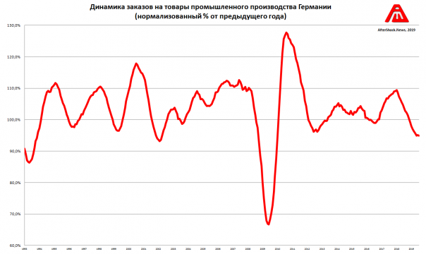 Так выглядят текущие показатели локомотива промышленности Европы. А что говорят заказы на товары промышленного производства, которые характеризуют будущую динамику производства?