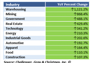 Согласно свежем отчету Challenger, Gray & Christmas по объявленным массовым увольнениям в США: