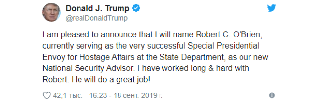 «Рад объявить, что назначу новым советником по национальной безопасности Роберта О'Брайена, который в настоящее время очень успешно работает спецпредставителем президента по делам заложников в Госдепартаменте. Я долго и много работал с Робертом. Он отлично справится!» — отметил Трамп.