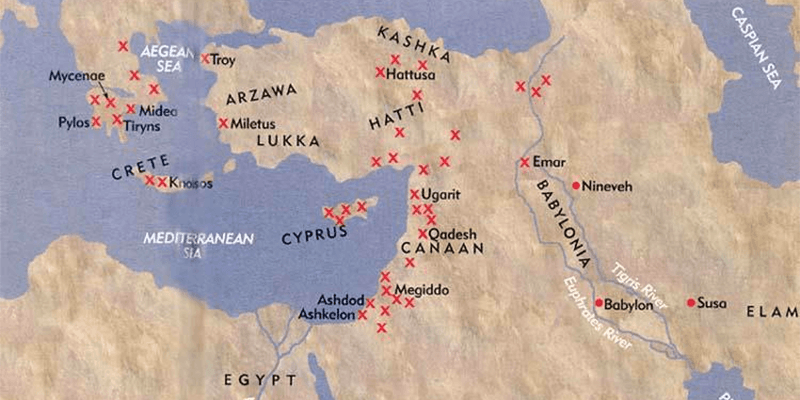 В начале XIII века до н. э. широкая полоса суши, лежащая приблизительно на широте Средиземноморья, представляла собой цветущую землю цивилизаций бронзового века. Для нас сложно представить, насколько развитым было общество той эпохи, но уже тогда от Европы до Индии стояли большие города, окружённые полями, испещрёнными сетью каналов. Блистали красотой грандиозные храмы и дворцы правителей. В городах существовали системы водоснабжения и канализации. Ремесленники создавали выдающиеся по красоте творения из золота, бронзы, стекла и керамики.