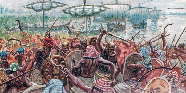 Долгое время историки, опираясь на лучше всего сохранившиеся источники Древнего Египта, считали, что причиной катастрофы стало вторжение хорошо вооружённых и воинственных дикарей — «народов моря». Эти племена из Греции и Малой Азии огнём и мечом пронеслись по всему Восточному Средиземноморью, грабя и разрушая всё на своём пути. Подобно викингам нашего времени, они снова и снова приплывали на своих кораблях, чтобы разорять поселения мирных земледельцев и ремесленников.