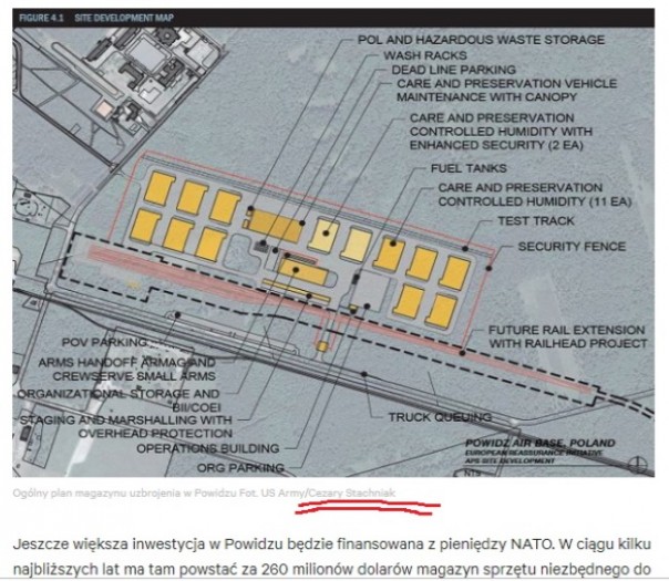 Заметьте, всё на английском языке, то есть надо полагать, что фотошопная работа Стачняка — это прежде всего сигнал англоязычной публике. Стачняк исправно посещает американские базы на территории Польши, делает фоторепортажи, пишет статьи, рисует графики. Вот, скажем, статья в Gazeta.pl о будущем «форте Трампа». Автор одного из снимков — плана расположения баз США в печально известном городке Повидзь — всё тот же Цезарь Стачняк.