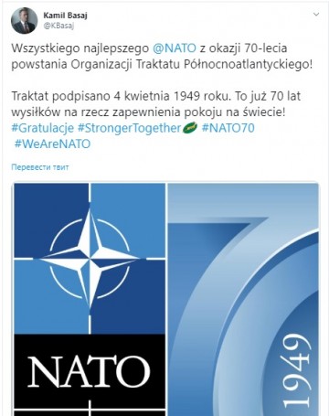 Среди задач: анализ польского информационного пространства, проведение коммуникационных мероприятий в киберпространстве, анализ информационных операций, в том числе психологических, журналистская деятельность. Президент фонда — известный в Польше «киберзащитник» Камиль Басай, работающий рука об руку с Альянсом. Вот он желает «всего наилучшего» НАТО по случаю 70-летия со дня образования.