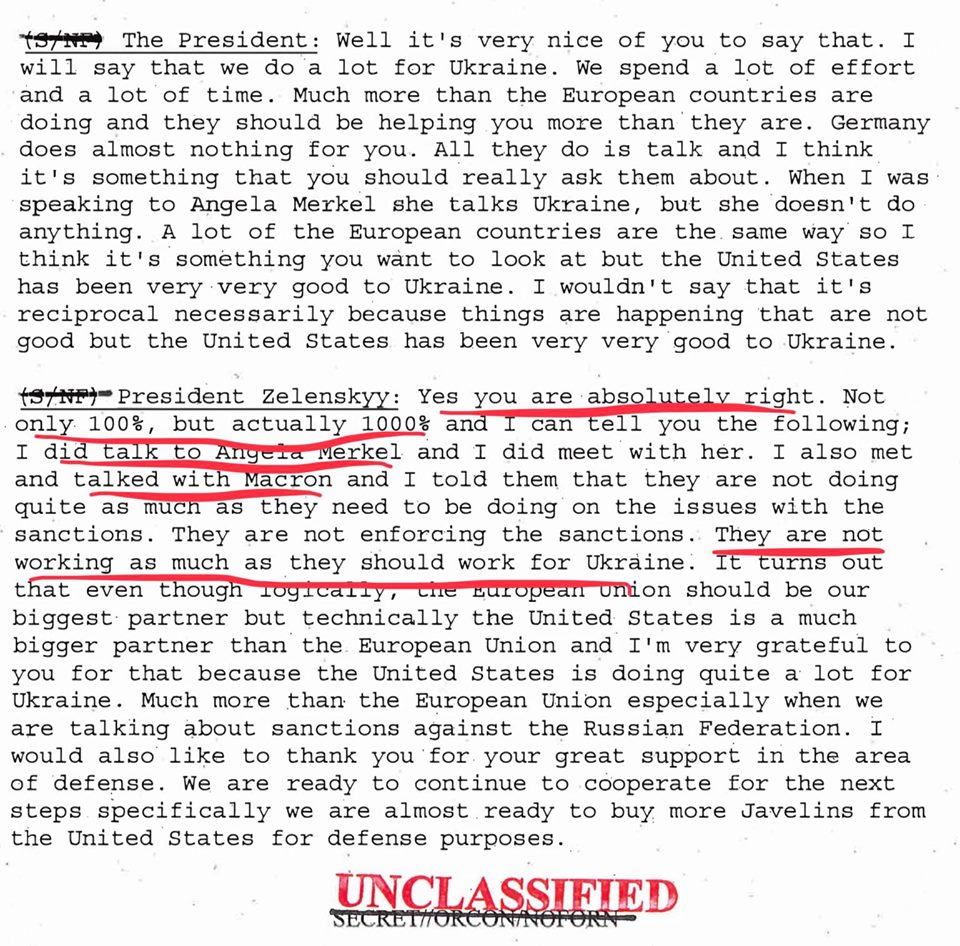 В разговоре Зеленский жалуется Трампу на то, что Франция и Германия недостаточно поддерживают Украину в плане антироссийских санкций. При этом Зеленский поддакивает президенту США, подчеркивая, что тот «прав на 1000%», озвучивая претензии лидерам Евросоюза.