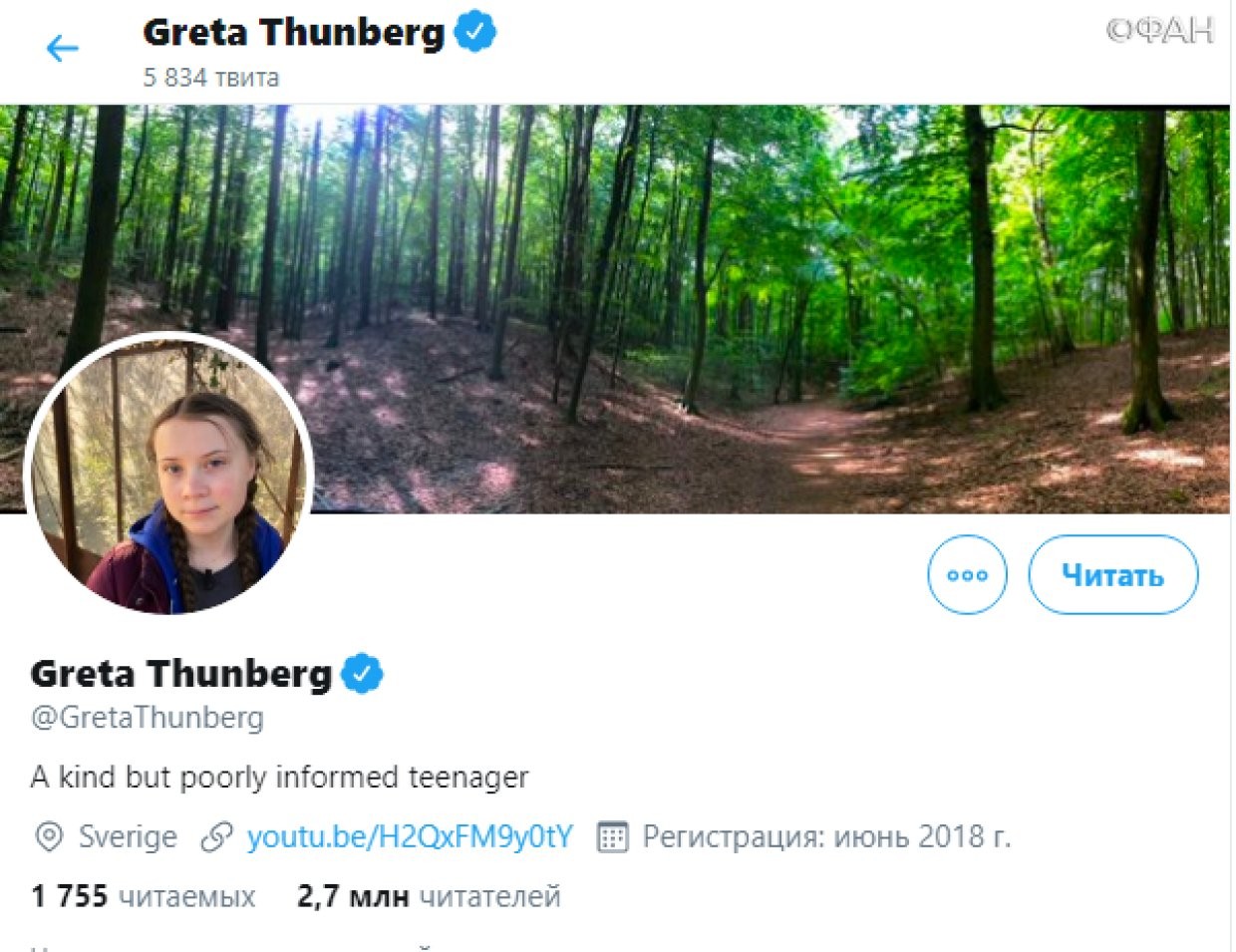 Описание в профиле Тунберг теперь гласит: "Добрая, но плохо информированная девочка".