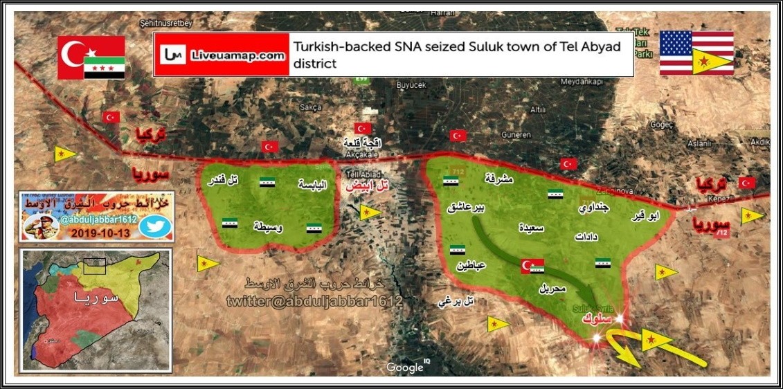 В ходе операции «Источник мира» армия Турции заняла город Сулук, расположенный на севере провинции Ракка, вытеснив из него боевиков SDF. В общей сложности, по данным Минобороны Турции, в ходе операции было ликвидировано 480 курдских боевиков. Кроме того, турецкое военное ведомство сообщило о гибели еще одного военнослужащего в ходе операции в ходе столкновений с курдскими террористами.