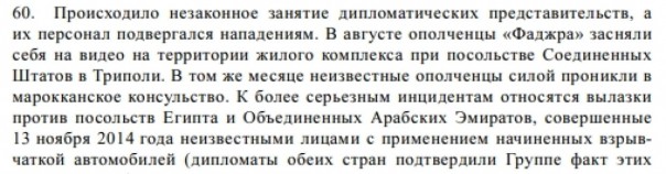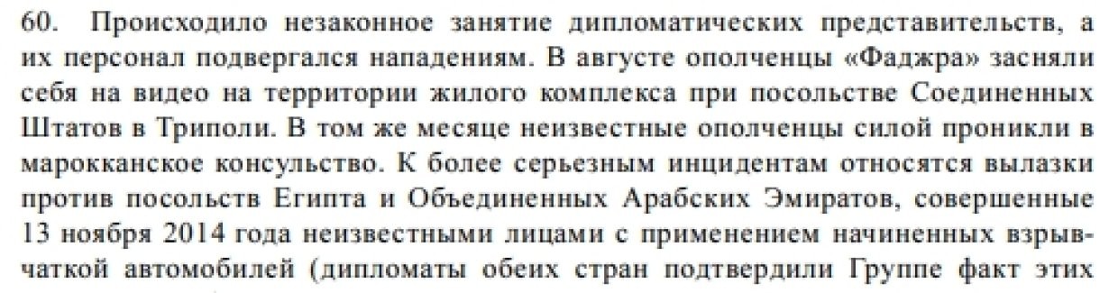 «Оперативный штаб революционеров Ливии» совершал нападение и на других дипломатов. Они совершали вылазки против посольства ОАЭ, проникали в марокканское консульство и на территорию жилого комплекса при посольстве США в Триполи. Об этом также стало известно из доклада Совбеза ООН.
